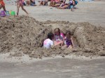 We took our bikes along so we could pedal down to Fred Benson Beach on Crescent Cove, which features enough surf to be interesting and miles of sand for barefoot treks. One industrious dad brought his shovel along and dug an enormous earthwork at the high tide line. It was such fun to see all the children splashing and giggling as the tide filled up the hole behind the sand. Of course, eventually the ocean won out, as it always does, even though the kids did everything they could to hold it back.