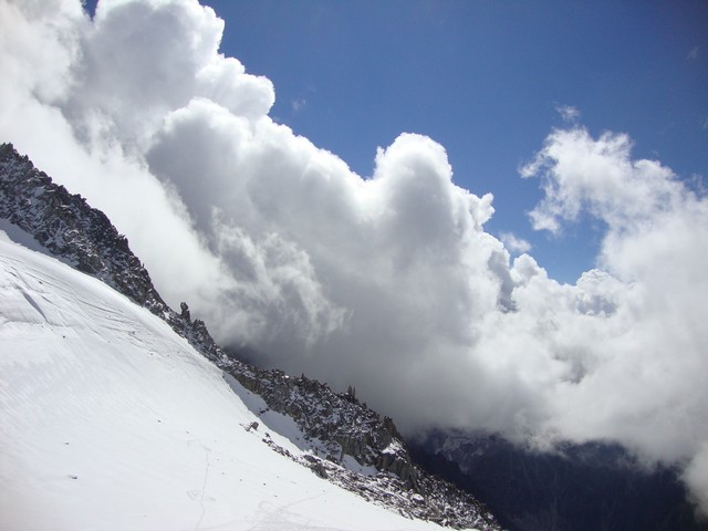 The weather was perfect, although there were lots of clouds at the top which kept us from seeing Mt. Blanc. Still, it was a balmy 32 degrees on top. On the way up, several people in the car had bulky backpacks with them. Turns out, these were folks into para-gliding, a sport which involves unfurling a large kite and just stepping off the side of the mountain and riding the thermals coming up from the valleys. Looks like fun! Other groups were hiking all over the glaciers. Apparently there is an annual race from Mt. Blanc to Zermatt, some 70 miles away. The good ones take about 24 hours for the trek. It would take me about 24 days…….